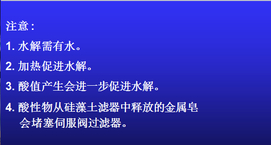 酸性環(huán)境下金屬離子會從過濾介質(zhì)中游離出來與抗燃油反應(yīng)產(chǎn)生磷酸金屬鹽利用介質(zhì)過濾器和定期沖洗系統(tǒng)來維持低酸值、低的水含量、高的電阻率是維一的手段。